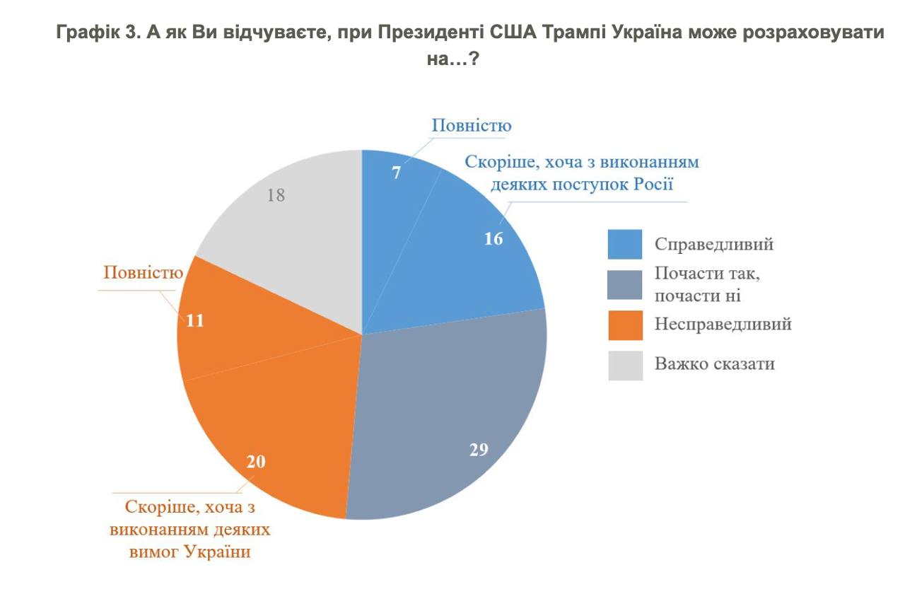 Наближення миру не означає, що він може бути справедливим для України, зауважили автори дослідження. Тому вони поставили відповідне запитання респондентам: чи може розраховувати Україна на справедливий мир при президенті Трампі? Лише 7% переконані, що мир може бути цілком справедливим для України. 11% вважають, що мир буде цілком несправедливим для України. Більшість громадян перебувають між цими крайніми думками. 23% вважають, що мир буде переважно чи цілком справедливим для України, а 31% – що буде переважно чи повністю несправедливим. Ще 29% вважають, що будуть і виконання вимог України, і поступки Росії. 18% не змогли визначитись зі своєю думкою.