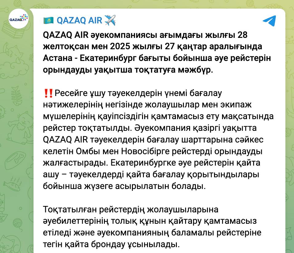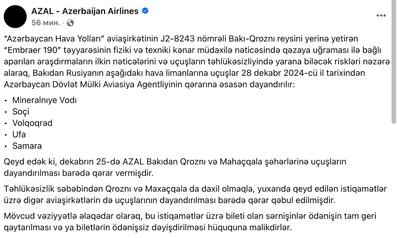 "На підставі попередніх результатів розслідування аварії літака..., що сталася через фізичне та технічне зовнішнє втручання, а також з урахуванням ризиків для безпеки польотів, Агентство цивільної авіації Азербайджану прийняло рішення з 28 грудня 2024 року призупинити рейси з Баку в наступні аеропорти Росії : Мінеральні Води, Сочі, Волгоград, Уфа, Самара", - йдеться в повідомленні Azerbaijan Airlines.