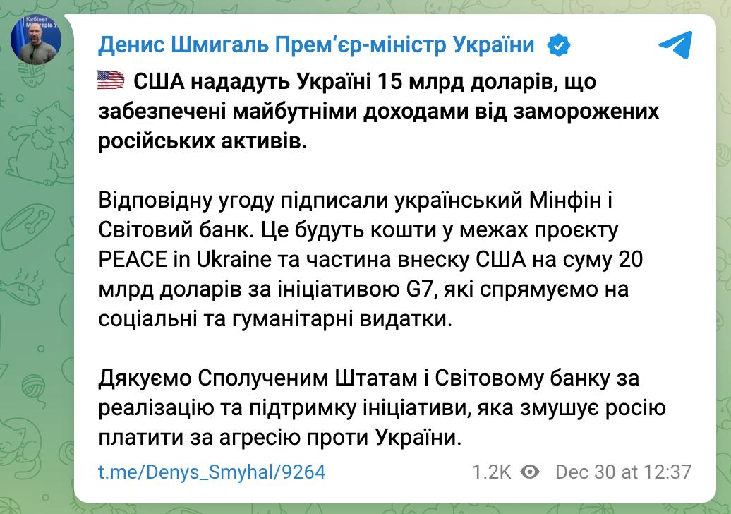 Тим часом прем'єр-міністр України Денис Шмигаль підтвердив підписання угоди зі Світовим банком про виділення США 15 млрд доларів, які будуть забезпечені майбутніми доходами від заморожених російських активів.