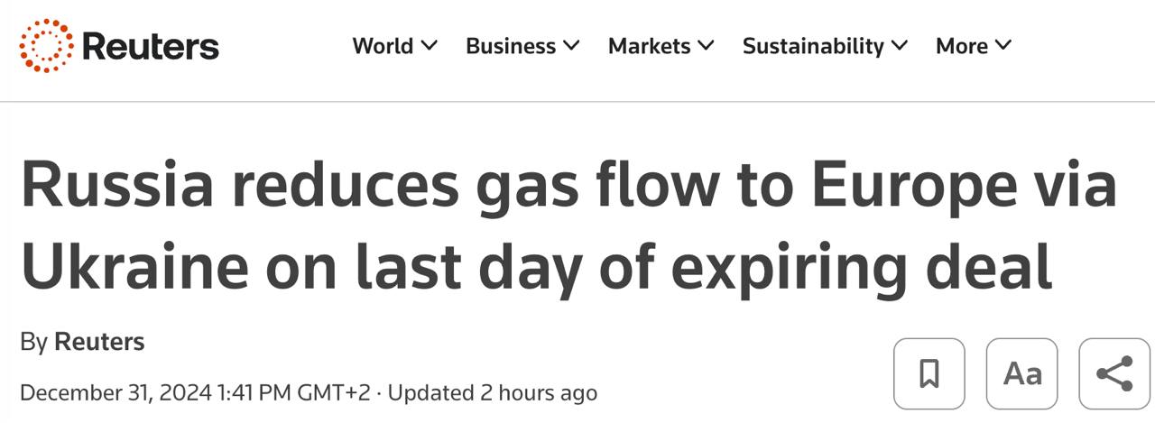 Російська енергетична компанія "Газпром" заявила, що 31 грудня постачатиме до Європи скорочений обсяг газу через Україну: 37,2 млн кубометрів порівняно з 42,4 млн кубометрів у понеділок. Якщо в останню хвилину несподівано не укладуть нову угоду, постачання газу швидше за все припиниться 1 січня після закінчення п'ятирічної транзитної угоди між Росією та Україною. Це "ознаменує майже повну втрату колись великого впливу Москви на європейський газовий ринок", пише агентство.