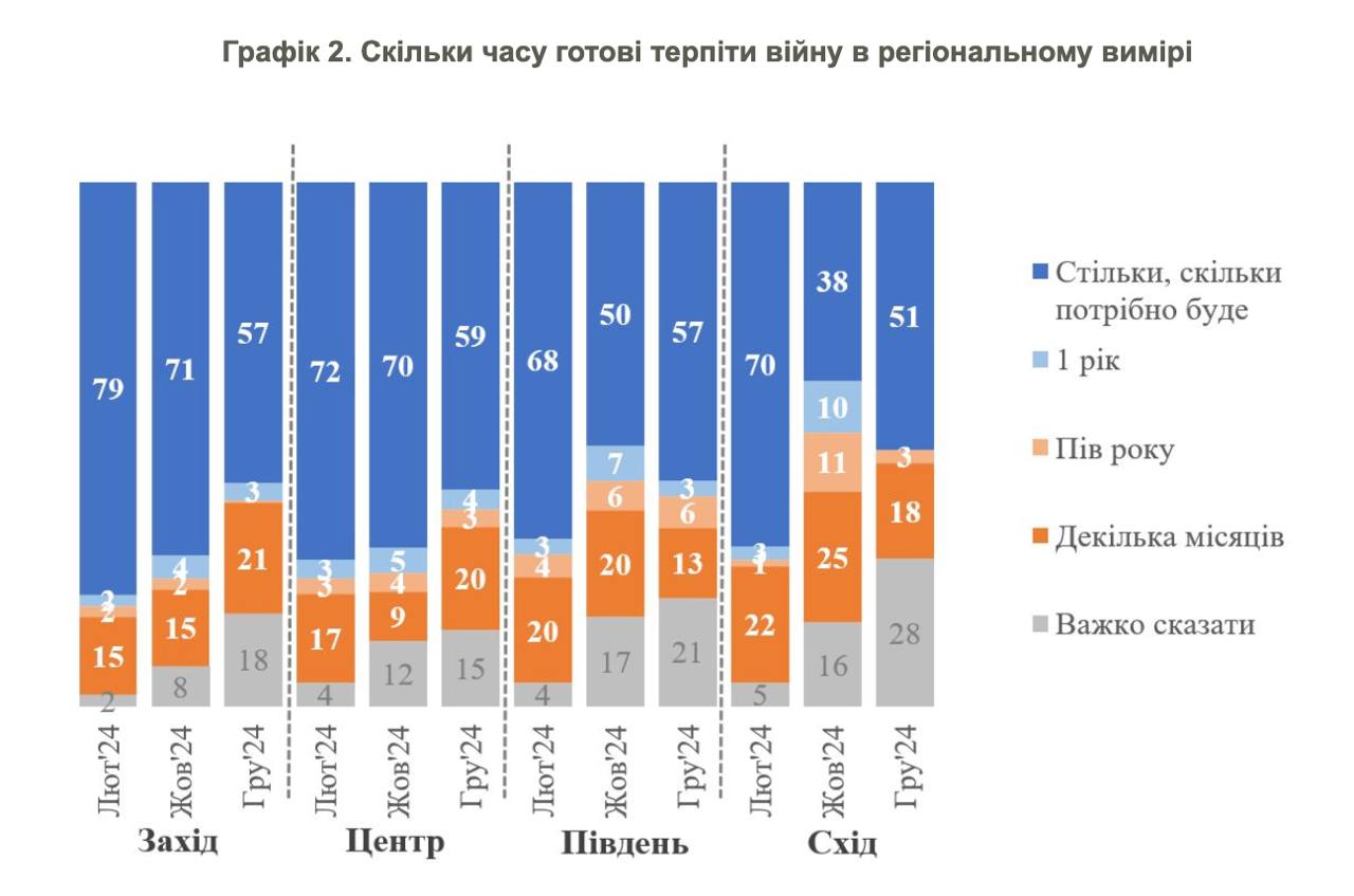 У КМІС також зазначили, що люди зі сходу виявилися менш готовими до затяжної війни (51%), ніж жителі півдня, заходу (по 57%) та центру України (59%).