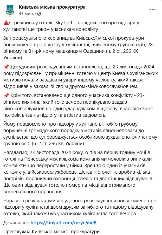 Через листопадову бійку та стрілянину в київському готелі Sky Loft, коли військовослужбовець ГУР застрелив людину, підозри у хуліганстві отримали ще троє: двоє друзів загиблого та інший відвідувач готелю.