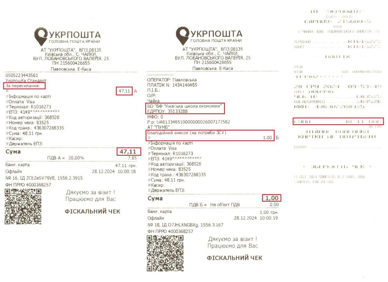 За її інформацією, державний оператор при оплаті послуг з доставки посилок додатково стягує 1 гривню як благодійний внесок на потреби ЗСУ до благодійного фонду "Київська школа економіки". Відмовитися від внеску неможливо.