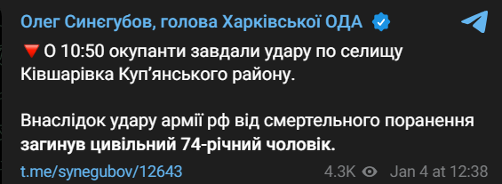 "Внаслідок удару армії РФ від смертельного поранення загинув 74-річний цивільний чоловік", - повідомив голова ОВА Олег Синегубов.