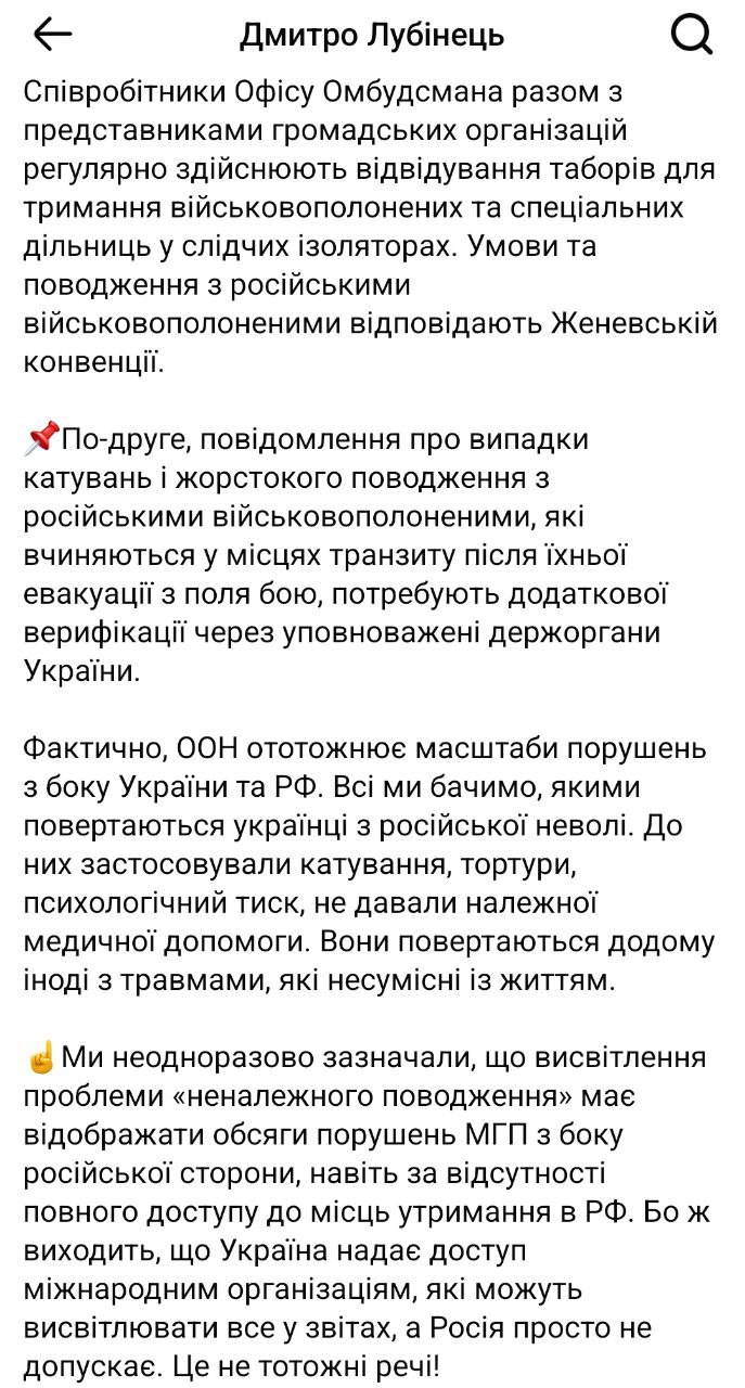 Уповноважений Верховної Ради України з прав людини Дмитро Лубинець розкритикував доповідь ООН про порушення прав людини в Україні за згадування тортур щодо російських військовополонених.