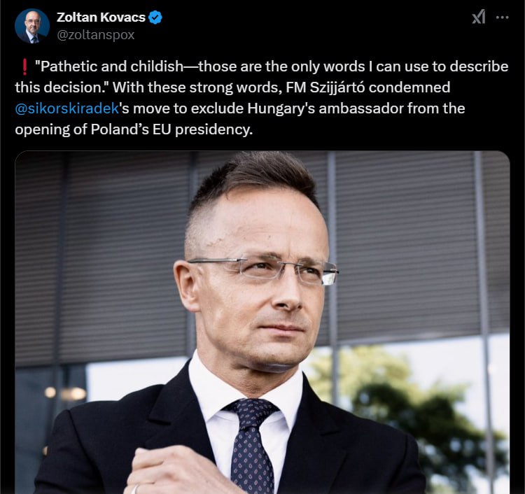 "Шкода і по-дитячому - це єдині слова, якими я можу описати це рішення", - написав держсекретар з публічної дипломатії та зв'язків із громадськістю Угорщини Золтан Ковач у соцмережі Х передаючи слова глави МЗС Петера Сійярто.