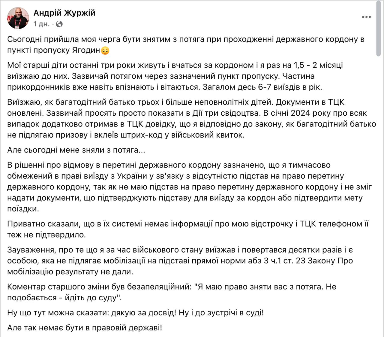 Засновника інвестфонду Inzhur Андрія Журжія не випустили за кордон як багатодітного батька. Про це він сам розповів у Facebook.