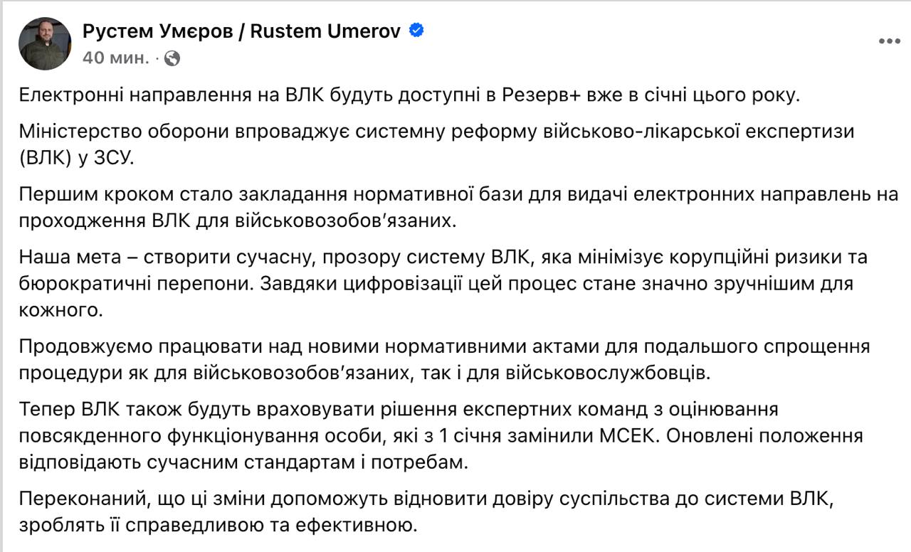"Міністерство оборони впроваджує системну реформу військово-лікарської експертизи (ВЛК) у ЗСУ. Першим кроком стало закладання нормативної бази для видачі електронних напрямків на проходження ВЛК для військовозобов'язаних... Тепер ВЛК також враховуватимуть рішення експертних команд з оцінки повсякденного функціонування особи, з 1 січня замінили МСЕК. Оновлені положення відповідають сучасним стандартам і  потребам", - написав чиновник.