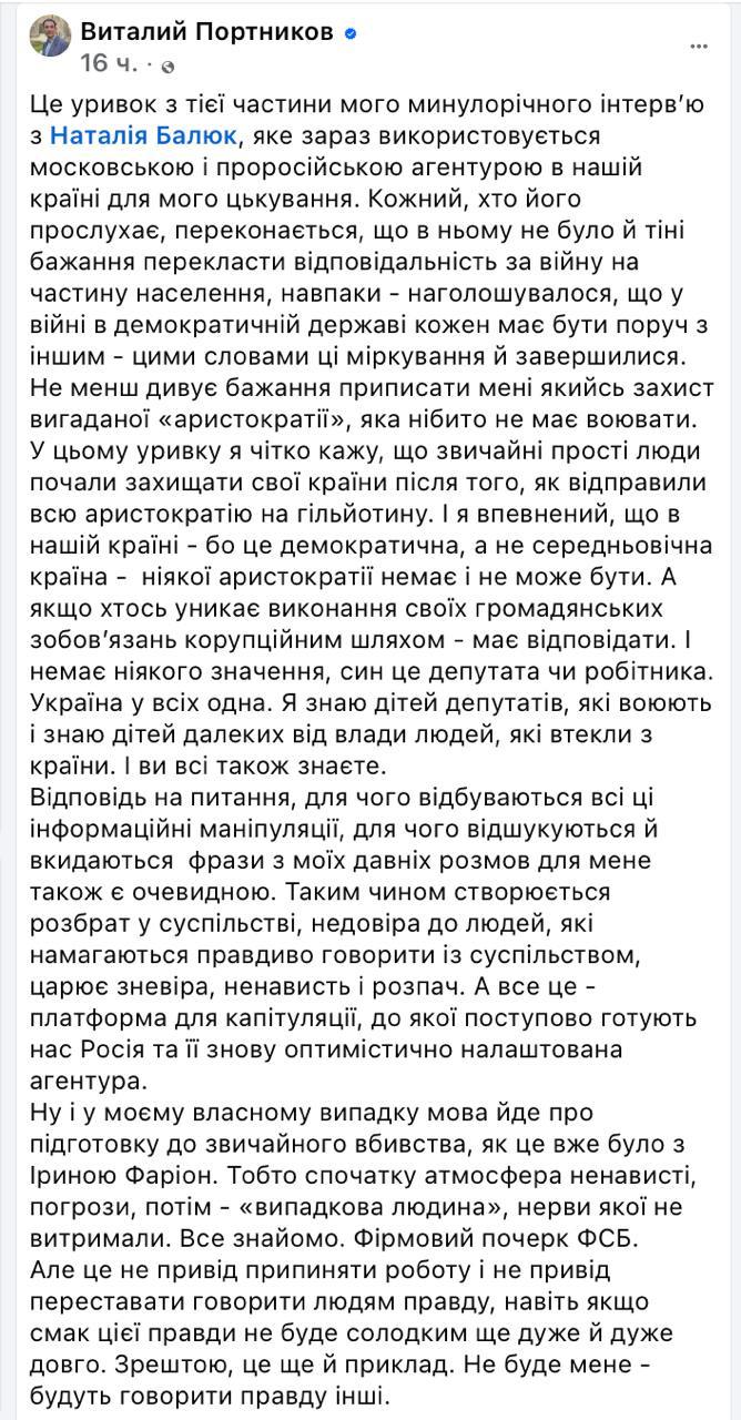 За словами Портникова, це інтерв'ю ще річної давності, яке почали розповсюджувати зараз для "розколу в суспільстві", а також, як стверджує журналіст, у рамках "підготовки до вбивства".