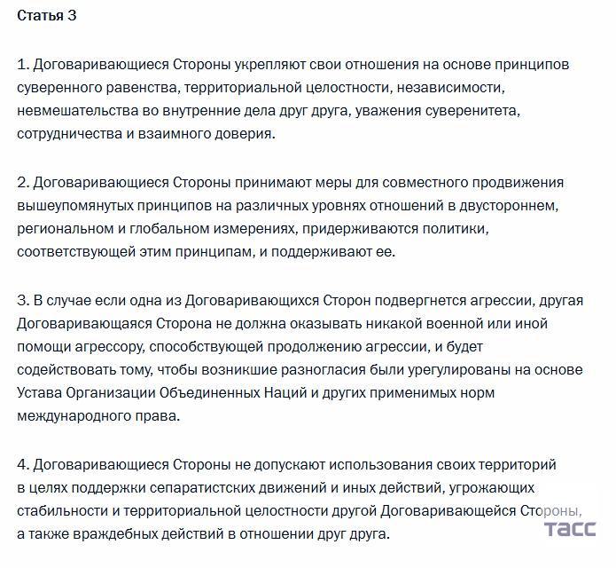 "У разі якщо одна з Договірних Сторін зазнає агресії, інша Договірна Сторона не повинна надавати жодній військовій або іншій допомозі агресору, що сприяє продовженню агресії, і сприятиме тому, щоб розбіжності, що виникли, були врегульовані на основі Статуту Організації Об'єднаних Націй та інших ", - йдеться у документі.