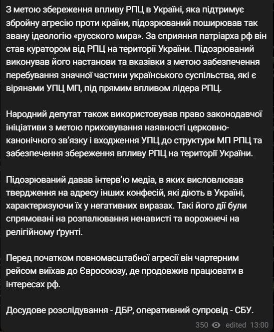 "Підозрюваний давав інтерв'ю медіа, в яких висловлював затвердження на адресу інших чинних в Україні конфесій, характеризуючи їх у негативних висловлюваннях", - заявляє Офіс генпрокурора.
