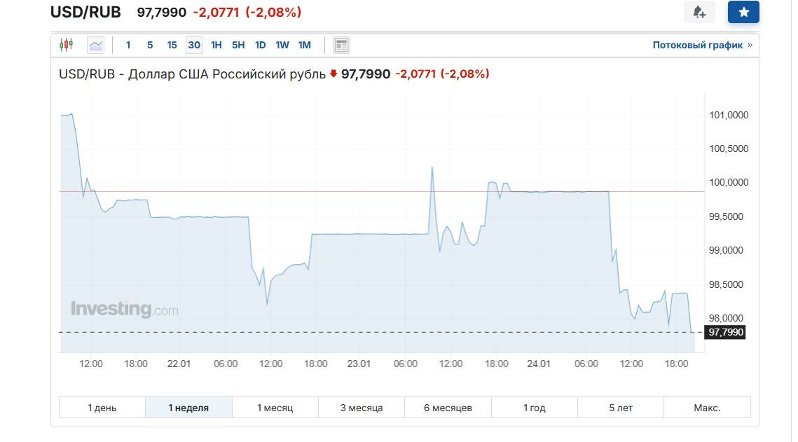 З початку тижня безготівковий курс рубль/долар суттєво зміцнився. Понеділок ринок почав високо, з рівня 102,6 руб./$, до середи курс долара просідав до 98,22 руб./$, а п'ятницю відступив на 97,8 руб./$.
