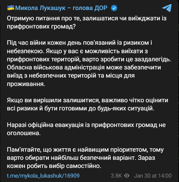 "Якщо у вас є можливість виїхати з прифронтових територій, слід зробити це заздалегідь. Поки що офіційної евакуації з прифронтових громад не оголошено", - написав Лукашук.