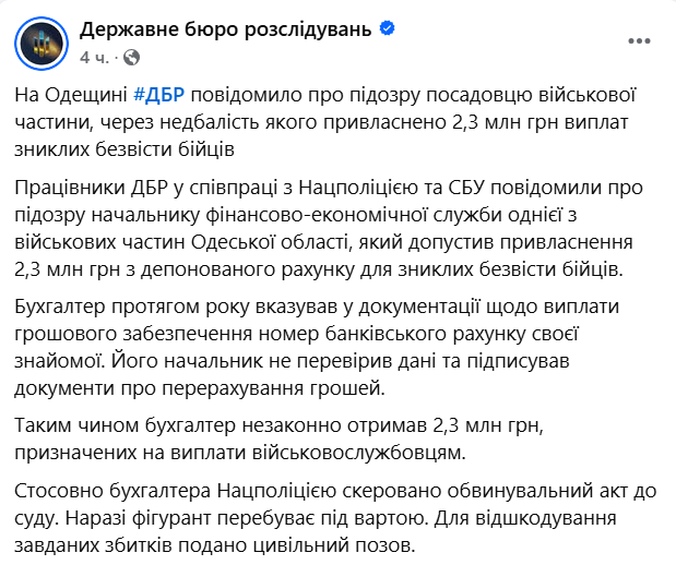 Бухгалтер військової частини на Одещині підозрюється у привласненні 2,3 млн грн виплат зниклих безвісти бійців.