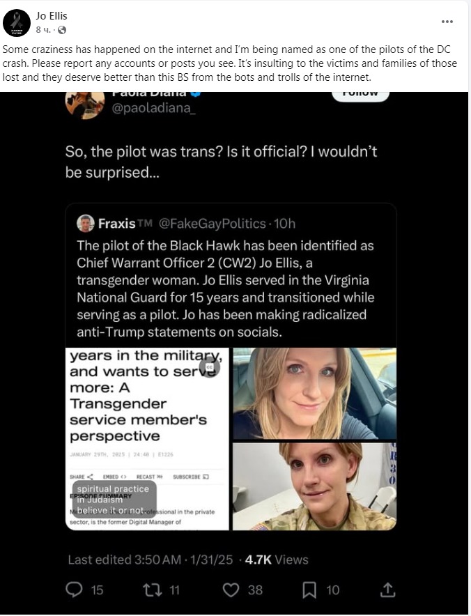 "В інтернеті твориться якесь божевілля, і мене називають одним з пілотів, причетних до катастрофи у Вашингтоні. Будь ласка, повідомляйте про будь-які облікові записи або посади, в яких ви таке бачите. Це образливо для жертв і сімей загиблих, і вони заслуговують на краще, чим це нісенітниця від ботів і тролів в інтернеті", - написала Елліс.