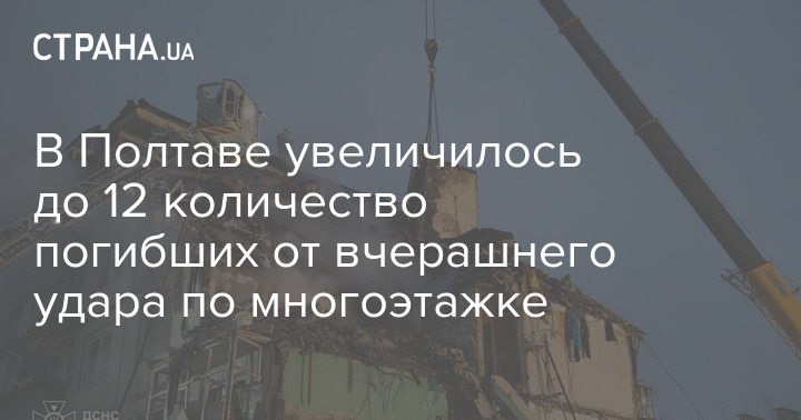 У Полтаві до 12 людей збільшилася кількість загиблих внаслідок вчорашнього удару по багатоповерхівці під час атаки РФ. Серед них дві дитини.