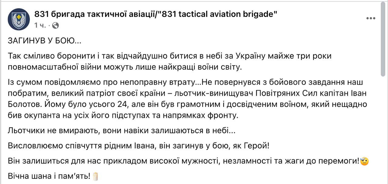 14.27 У бою загинув льотчик-винищувач, 24-річний капітан Повітряних сил Іван Болотов. Він воював із початку вторгнення.