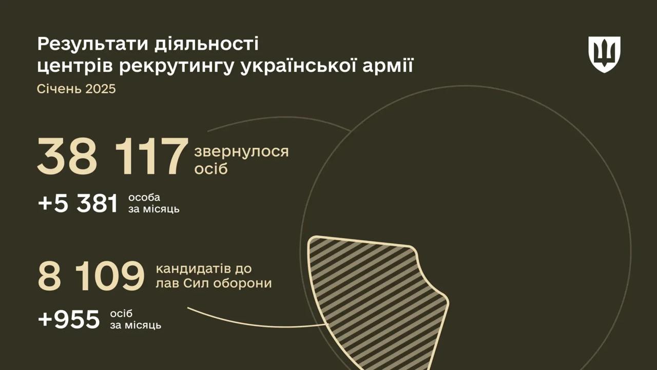 "У січні 2025 року до центрів звернулося 5 381 особа, що майже на 80% більше середньомісячного показника минулого року. Протягом січня кількість кандидатів, які розпочали процес вступу до армії, зросла на 955 осіб і досягла 8 109", - йдеться у повідомленні.