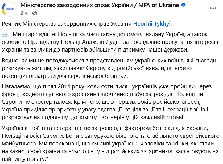 Міністерство закордонних справ України прокоментувало заяву польського президента Анджея Дуди про погрози через повернення українських солдатів з фронту.