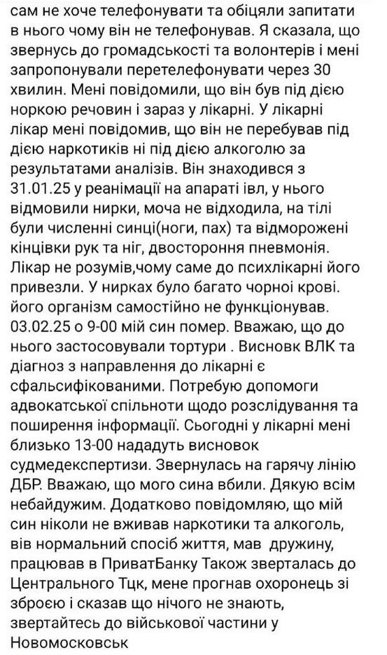 "У нирках було багато чорної крові. Його організм самостійно не функціонував. 03.02.25 о 9:00 мій син помер. Вважаю, що до нього застосовували тортури. Виведення ВЛК та діагноз про направлення до лікарні було сфальсифіковано", - розповіла жінка.