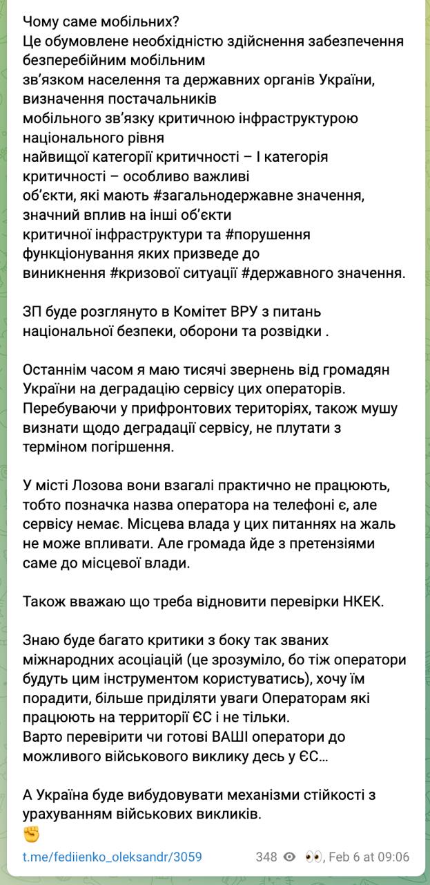 "Це обумовлено необхідністю здійснення забезпечення безперебійним мобільним зв'язком населення та державних органів України", - пише нардеп.