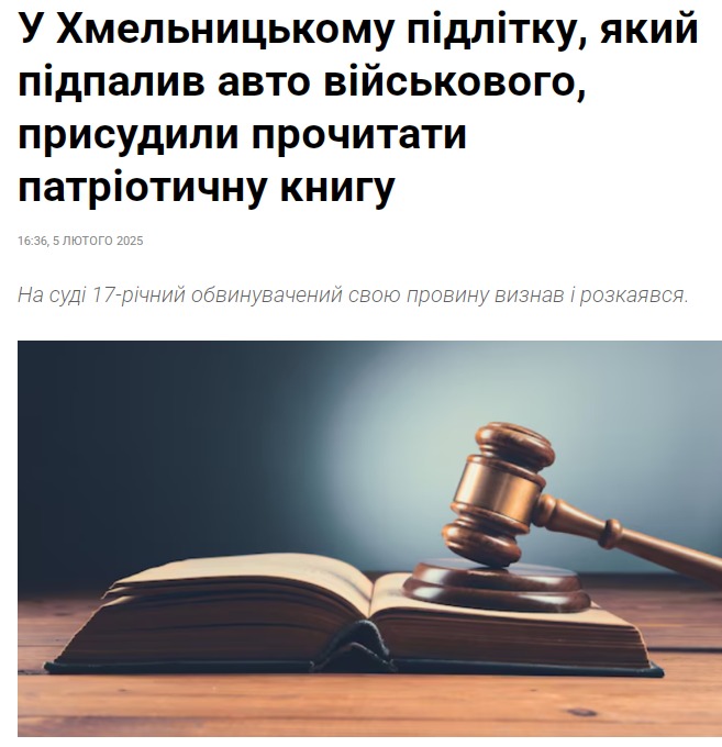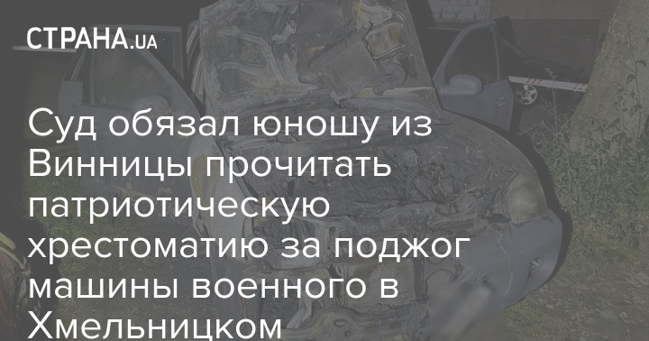 У Хмельницькому 17-річний юнак з Вінниці підпалив автомобіль військового, за що Хмельницький міськрайонний суд призначив йому умовне покарання, зобов'язавши прочитати книгу "З Україною в серці. Патріотична хрестоматія".