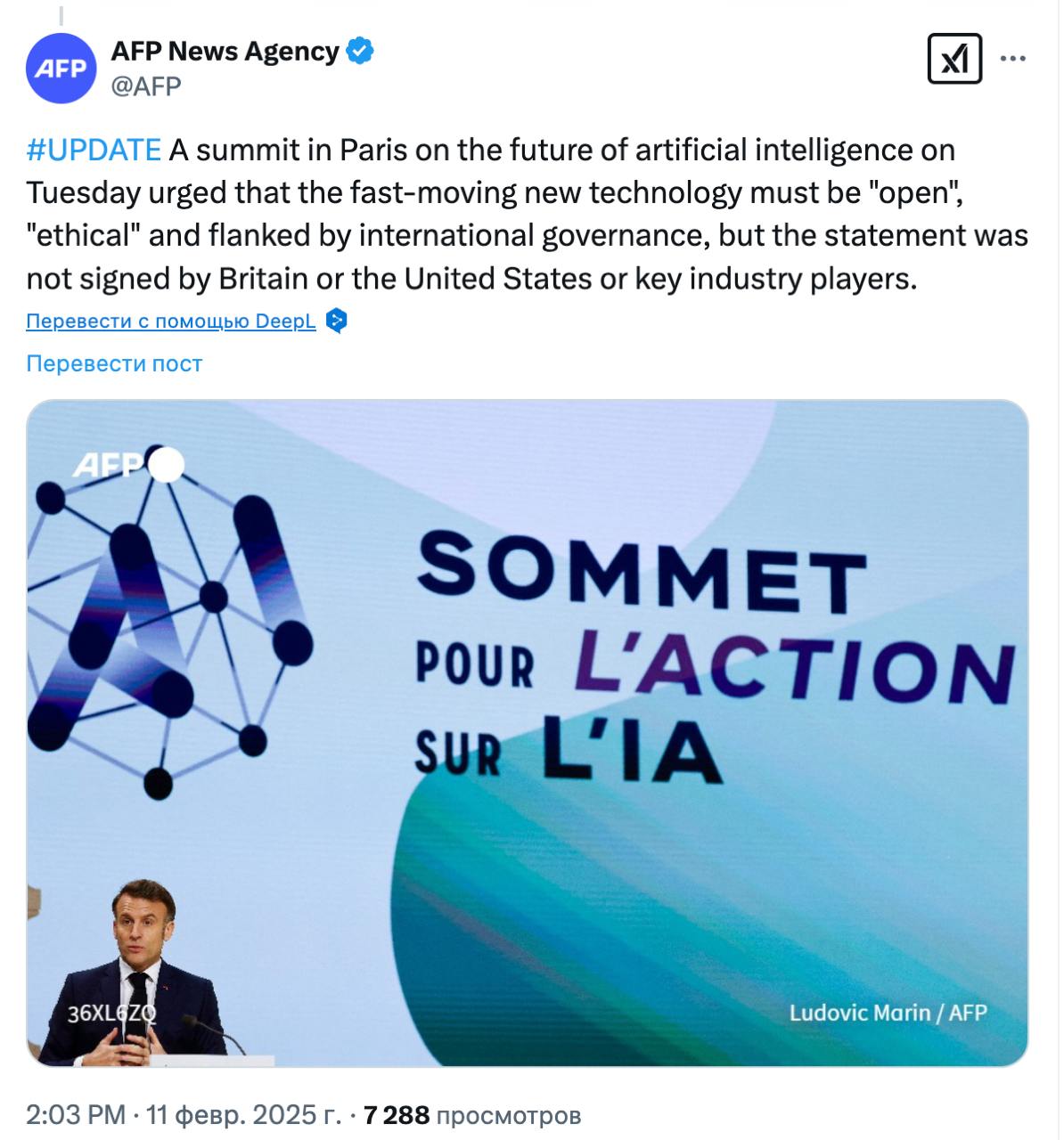 США та Велика Британія не стали підписувати декларацію про відкритий, інклюзивний та етичний штучний інтелект, прийняту за підсумками міжнародного саміту в Парижі з ШІ, який розпочав роботу вчора і завершується сьогодні. У заході беруть участь запрошені світові лідери та провідні міжнародні компанії.