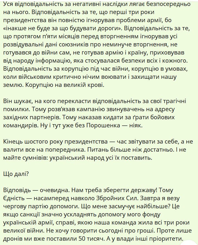"Він шукає, на кого перекласти відповідальність за свої трагічні помилки. Тому він запустив кампанію звинувачень на адресу західних партнерів. Тому наказав кидати за ґрати бойових командирів. Ну і тут уже без Порошенка – ніяк", – написав екс-президент.