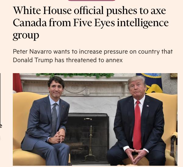 Один із найближчих радників президента США Пітер Наварро наполягає на тому, щоб США виключили Канаду з Five Eyes, куди також входять Великобританія, Австралія та Нова Зеландія.