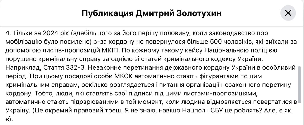 2024 року понад 500 артистів та журналістів призовного віку, які отримали дозвіл від Мінкульту на виїзд, назад не повернулися, повідомляє радник міністра культури Дмитро Золотухін.