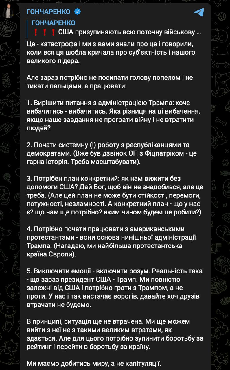 "Реальність така - що зараз президент США - Трамп. Ми повністю залежні від США і потрібно грати з Трампом, а не проти. У нас і так вистачає ворогів, давайте хоч друзів втрачати не будемо", - закликає Гончаренко і вимагає "добитися миру, а не капітуляції".