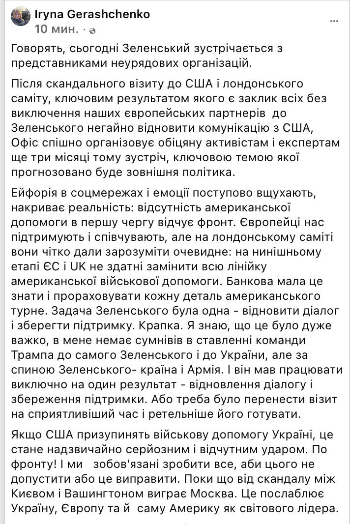 "Європейці нас підтримують і співчувають, але на лондонському саміті вони чітко дали зрозуміти очевидне: на даному етапі ЄС та Великобританія не здатні замінити всю лінійку американської військової допомоги. Банкова мала це знати і прораховувати кожну деталь американського турне", - пише Геращенко.