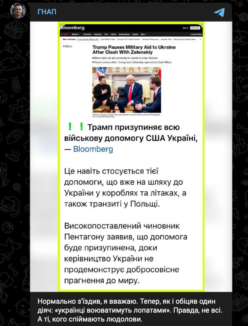 Журналіст Дмитро Гнап, який зараз служить у ЗСУ, також ув'язав відмову у постачанні зброї із провальним візитом Зеленського до Трампу.