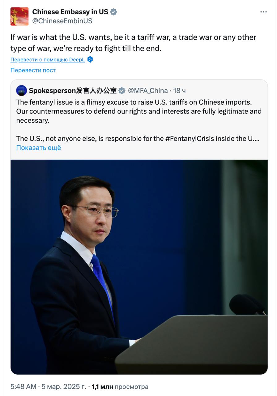 Спікер відомства пише, що постачання наркотику фентанілу, які Трамп позначив як причину запровадження тарифів, - це "жалюгідний привід". Зазначається, що Пекін зробив рішучі кроки для допомоги США з цією проблемою, проте США "покарали" Китай за це, продовжуючи намагатися чинити тиск і шантажувати.