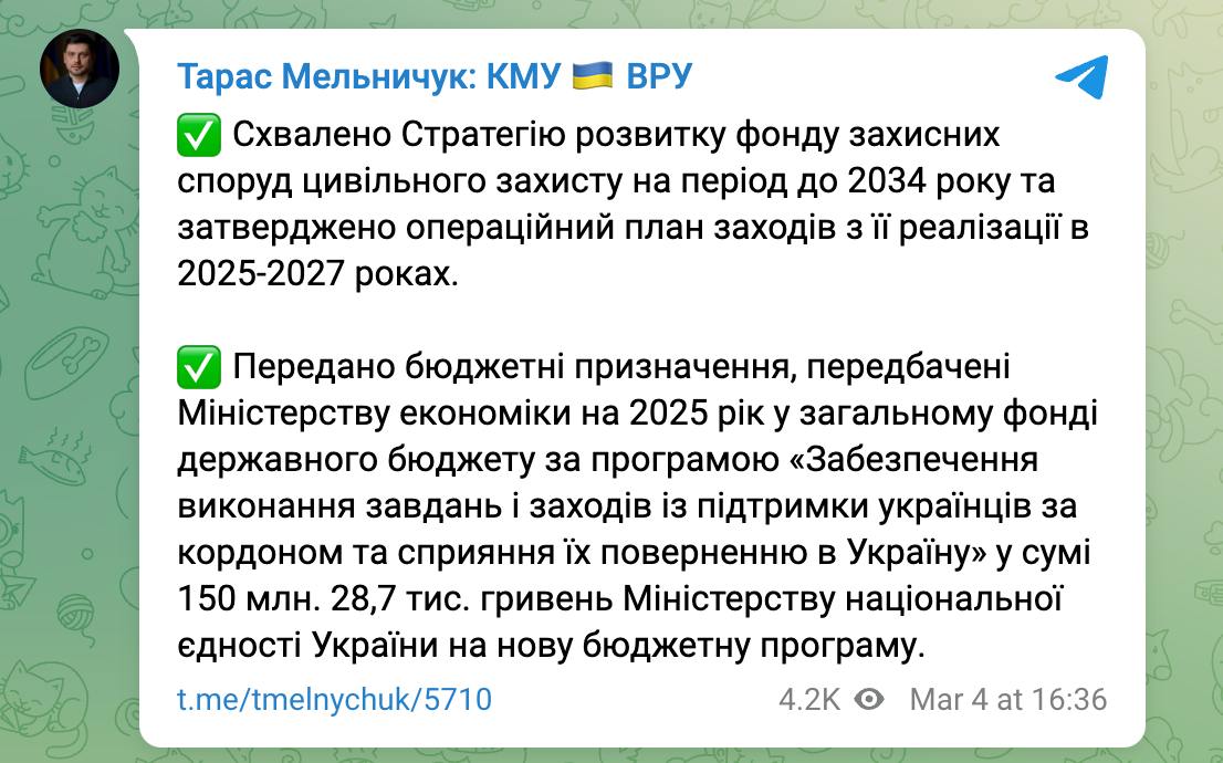 Про це повідомив у своєму телеграм-каналі за підсумками засідання уряду 4 березня представник Кабміну у Верховній Раді Тарас Мельничук.
