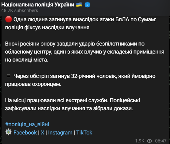 Сьогодні вночі російські війська атакували ударними дронами Суми. Сталося влучення по складському приміщенню на околиці міста. Загинув чоловік.