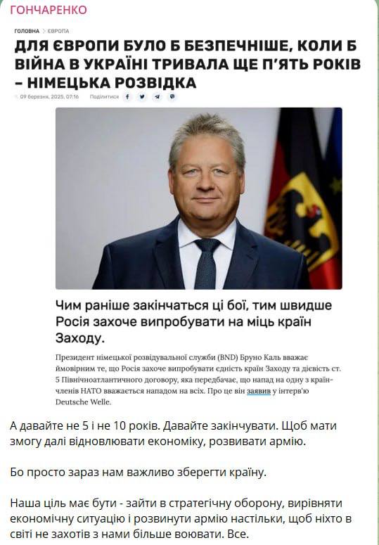Також Гончаренко, як і раніше Юлія Тимошенко, розкритикував заяву голови німецької розвідки про те, що Європі вигідно, щоб війна в Україні тривала до 2030 року.