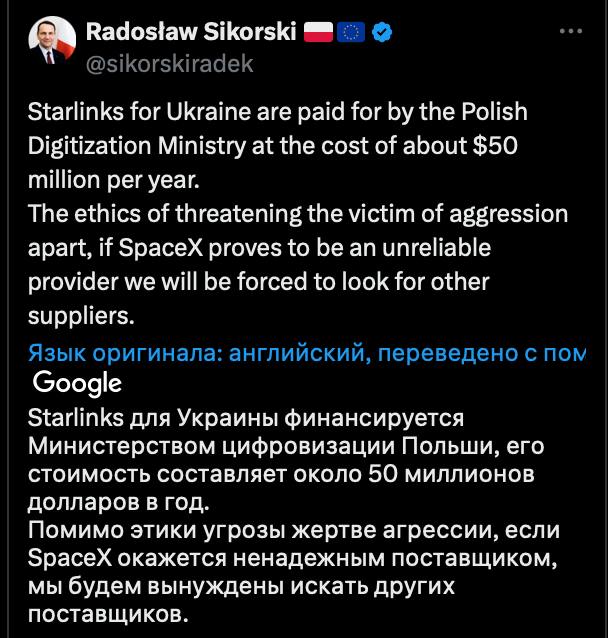 "Якщо говорити гранично ясно, то як би я не був згоден з політикою щодо України, Starlink ніколи не відключить свої термінали. Я просто заявляю, що без Starlink українські лінії зв'язку впадуть, оскільки росіяни можуть заглушити всі інші комунікації! Ми ніколи не зробимо нічого подібного і не скористаємося".