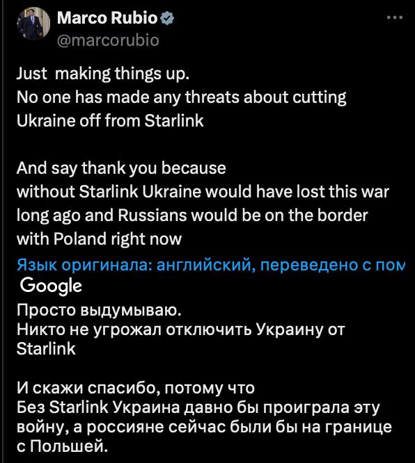"Ніхто не погрожував відключити Україну від Starlink. І дякую, бо без Starlink Україна давно б програла цю війну, а росіяни зараз були б на кордоні з Польщею", – написав представник Білого дому.
