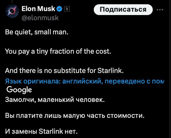 "Помовч, маленька людина. Ви платите лише малу частину вартості. І заміни Starlink немає", - написав власник компанії.