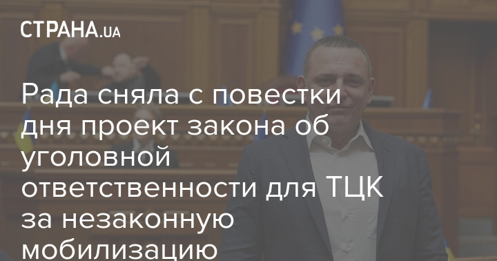 Верховна Рада України зняла з порядку денного законопроект, який запроваджує кримінальну відповідальність для службовців територіальних центрів комплектування у разі мобілізації чоловіків без законних підстав.