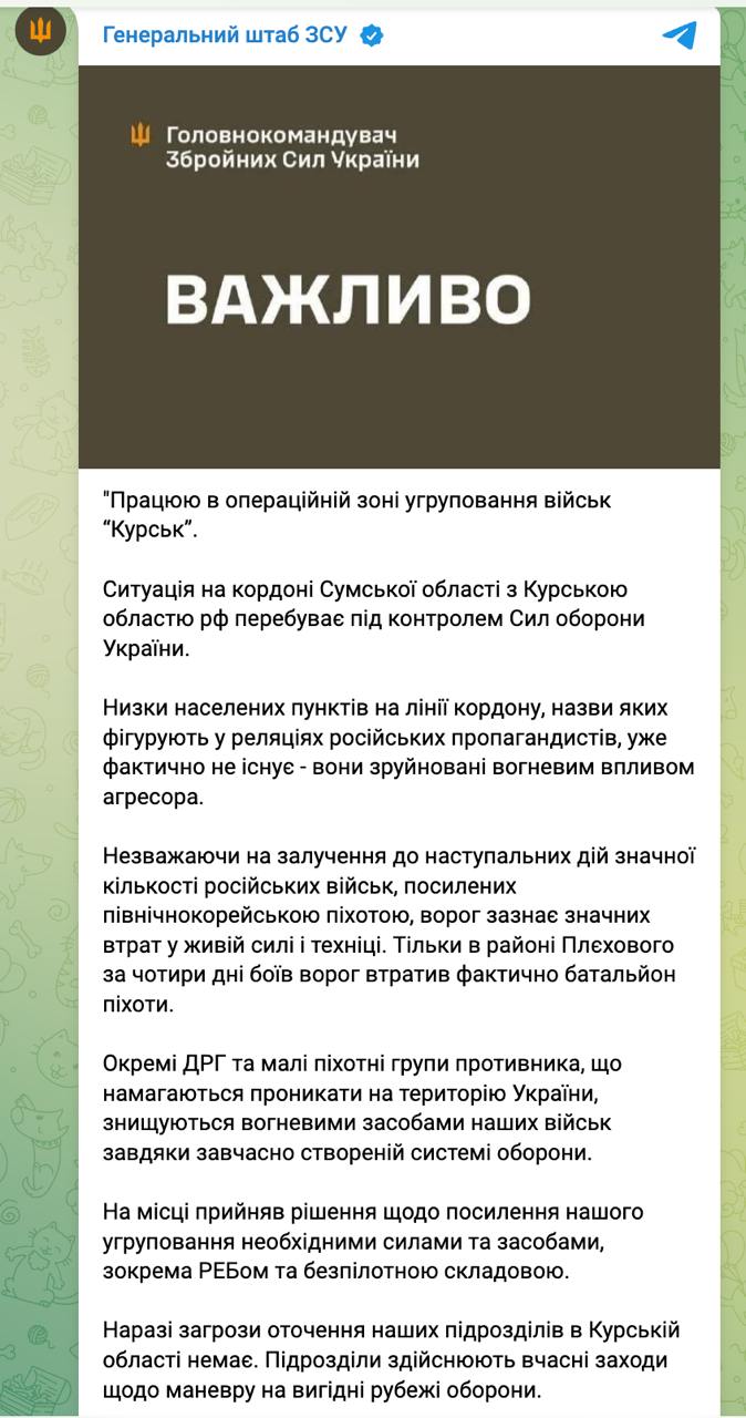 При цьому він заявив, що загрози оточення ЗСУ у Курській області немає, а "ситуація на кордоні Сумської області з Курською областю РФ знаходиться під контролем Сил оборони України".