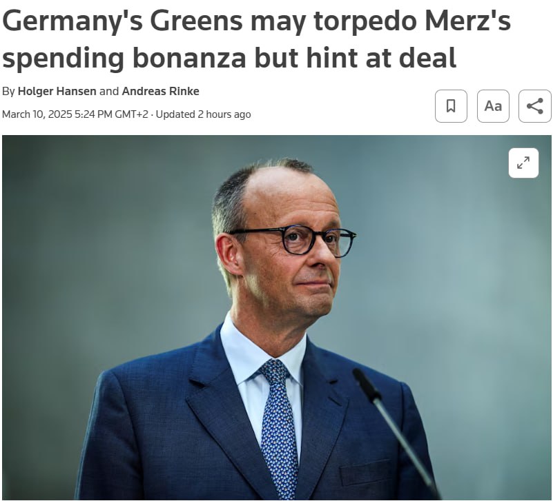 За інформацією агентства, партія "Зелених" може не підтримати план Фрідріха Мерця щодо збільшення державних витрат та створення спеціального фонду у 500 млрд євро, більша частина з яких має піти на оборонний сектор. Один із представників партії зазначив, що "схвалення стає все менш ймовірним з кожним днем". "Зелені" хочуть, щоб фонд також фінансував додаткові заходи щодо захисту клімату.