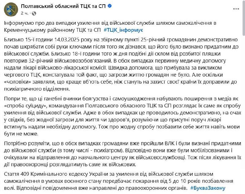 "Ганебні вчинки боягузливості та самоушкодження набувають поширення в медіа як "спроба суїциду", командування Полтавського обласного ТЦК та СП розглядає їх як спробу ухилення від військової служби", - пише ТЦК.