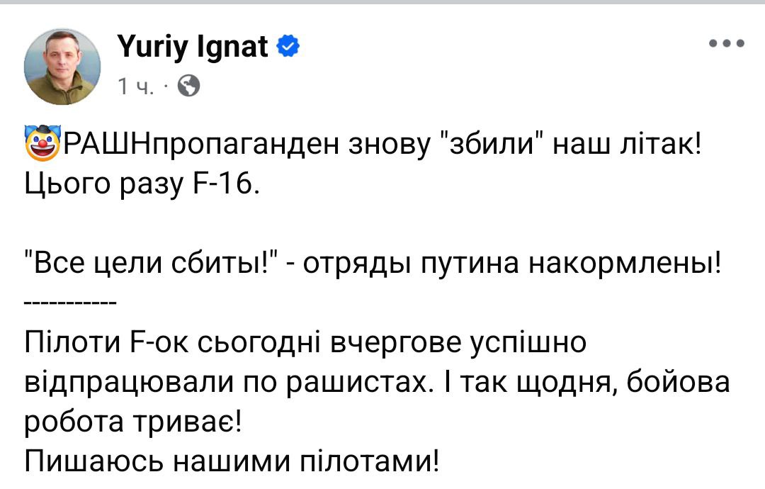 Зазначимо, що вчора українські паблики показували кадри прольоту F-16 над Сумщиною. Гнат підтвердив, що ці літаки там працюють останніми днями.