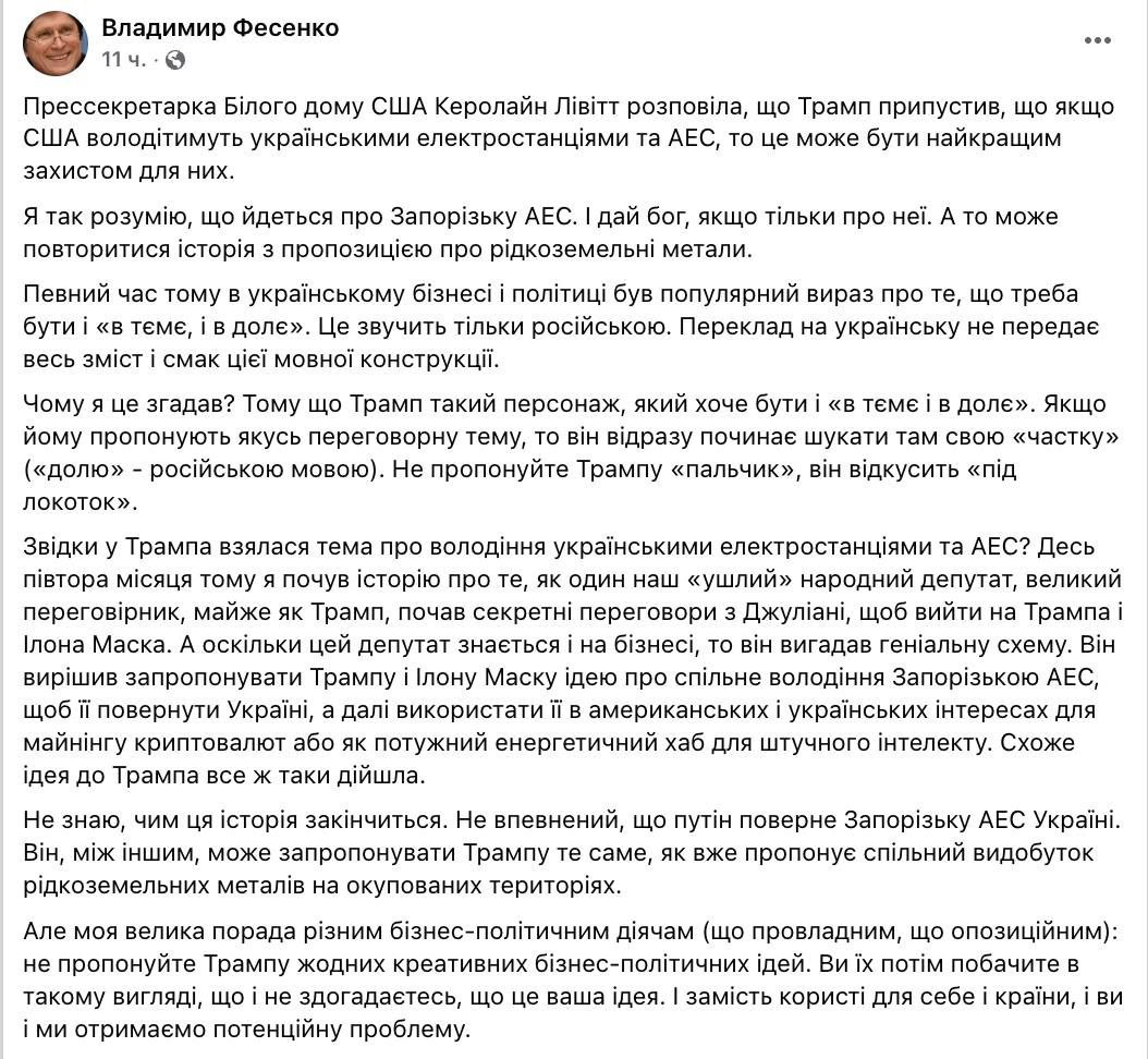 Ідею з контролем США над українськими електростанціями Трампу підкинув український народний депутат. Про це пише у себе у Facebook політолог Володимир Фесенко, який вважається близьким до Офісу президента.