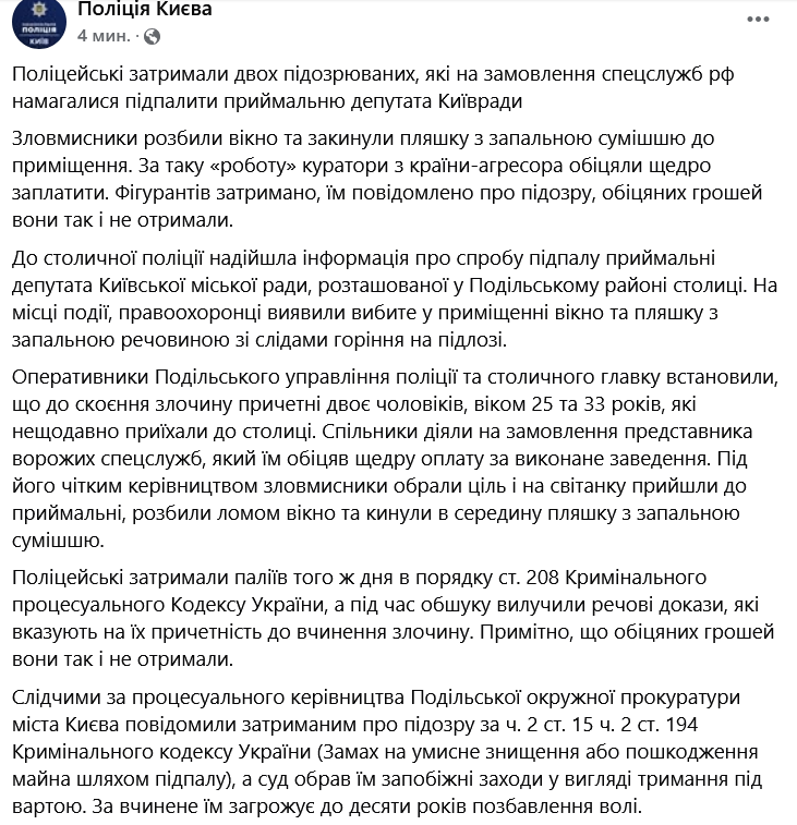 У Києві кинули коктейль Молотова до приймальні депутата. Зловмисників підозрюють у зв'язках зі спецслужбами РФ