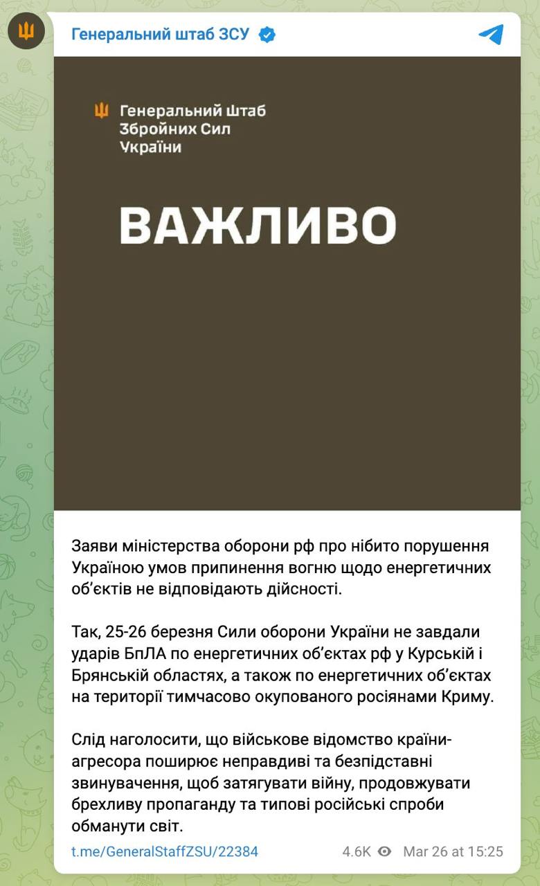 25-26 березня Сили оборони України не завдавали ударів БПЛА по енергетичних об'єктах Росії у Курській та Брянській областях, а також по енергетичних об'єктах на території тимчасово окупованого росіянами Криму", - йдеться у повідомленні.