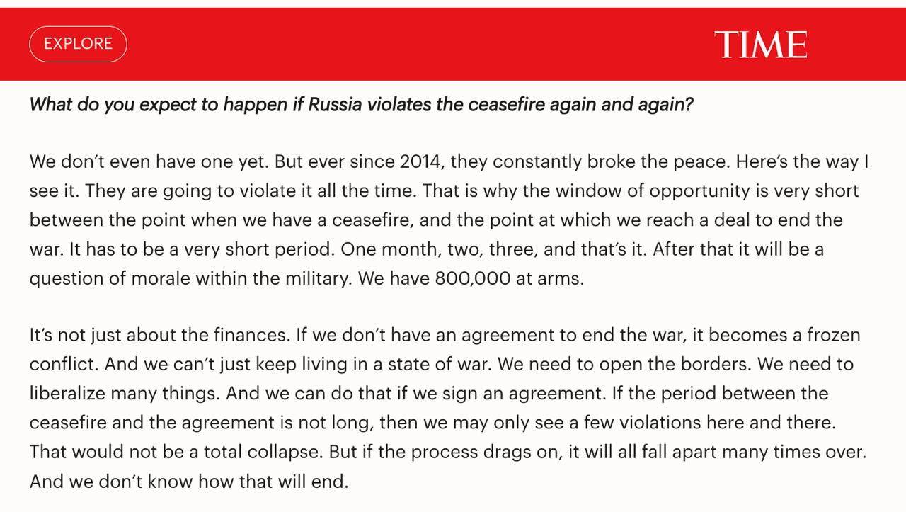 8.58 Пауза між припиненням вогню та остаточним світом не має бути довгою, інакше може впасти моральний дух ЗСУ, і в Україні розпочнуться деструктивні процеси. Про це заявив Зеленський в інтерв'ю журналу Time.