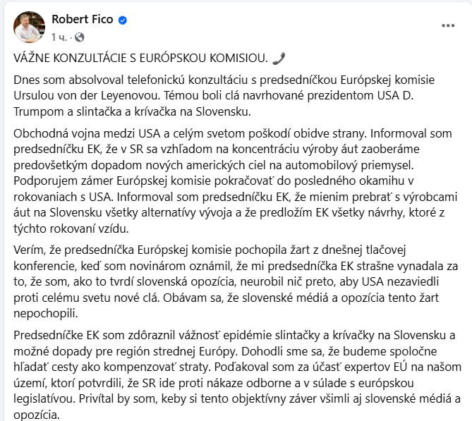 "Я сподіваюся, що глава Єврокомісії зрозуміла жарт на сьогоднішній прес-конференції, коли я сказав журналістам, що глава ЄК жахливо лаяла мене за те, що я не зробив нічого, як стверджує словацька опозиція, щоб запобігти введенню нових американських тарифів проти всього світу. Боюся, що словацькі ЗМІ та опозиція не зрозумiли", - написав Фiцо.